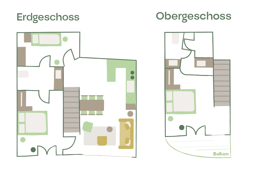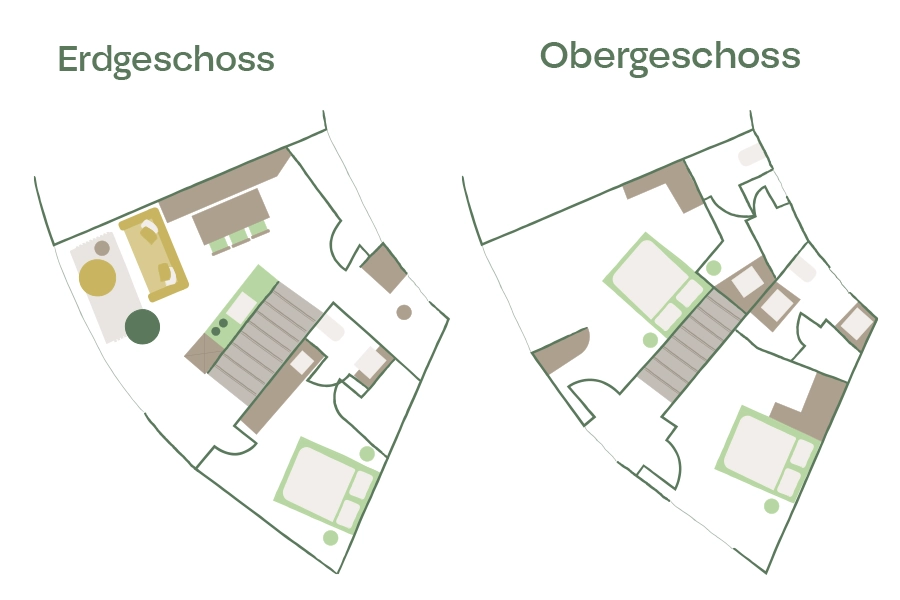 - EG: 1 Schlafzimmer mit Doppelbett (trennbar) sowie 1 Schlafzimmer mit Einzelbett und gemeinsamen Bad