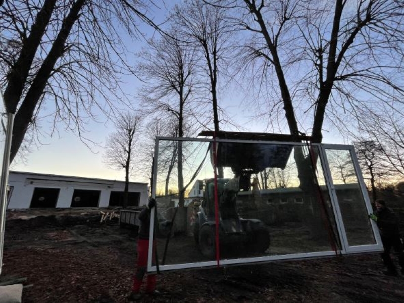 Wie großartig wäre es, ein Gebäude zum großen Teil aus Material zu bauen, welches normalerweise beim Abriss der alten Gebäude entsorgt worden wäre? Und darüber hinaus noch die Idee von nachhaltiger Bauweise zu verwirklichen! Es war schon lange mein Wunsch, ein Gebäude aus einer Holzständerbauweise zu verwirklichen. Neben den aufwendigen Vorschriften, die ein solches Gebäude zu erfüllen hat, kam ausgerechnet im März 2020 noch die Pandemie hinzu. Dieser folgten die größten wirtschaftlichen Verwerfungen seit dem 2. Weltkrieg und der globale Handelssupergau. Holz war nicht mehr bezahlbar! Was tun? Wir bauten in Handarbeit in unzähligen Stunden alle verwertbaren Stoffe und Materialien aus den alten Häusern aus – mit dem Ziel ein Upcycling Haus zu bauen. Eine besondere Herausforderung war die Sicherung von 5m x 3m großen Glasscheiben. Wir hatten nicht daran geglaubt, diese vollständig und ohne Bruch aus-& wieder einbauen zu können. Millimeterweise bewegten ein Kran die schweren und zerbrechlichen Werkstoffe. Es gelang! Alle Materialien lagerten wir in einem extra dafür errichteten riesigen Zelt.